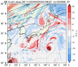 図4 2日目(30日15時)の500hPa面の高度・渦度予想図