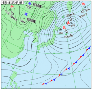 冬型が強まるかどうかは、予想天気図で確認するのがおすすめです。図1のように、等圧線が日本付近でびっしりと走り、間隔が狭いときは冬型が強いときです。