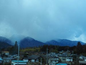 韮崎を過ぎると左手に鳳凰三山が見えてきますが、写真2のように、山に雲がかかっているときは冬型が強いか上層の寒気が強い証拠です。いずれにしても山は吹雪いていると思った方が良いでしょう。鳳凰三山~甲斐駒ヶ岳でこのレベルだと、八ヶ岳や中央アルプスはもっと悪い天気になっているはずで、北アルプスは猛吹雪や大雪に見舞われることが多くなります。このようなときは、小淵沢付近から雪がちらつき、富士見駅付近では吹雪いていることもあります。