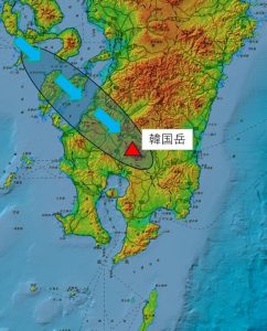 この日は、上空の風が午前中は北~北北西風、午後は北西~西北西風に変わりました。北北西風の場合、図1のように東シナ海からの雲は薩摩半島に入り、霧島連山や大隅半島にはかかりません。写真1の遠くに見える雲は、東シナ海から薩摩半島方面に広がる雲です。