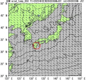 午後になると、風向が北西風~西北西風に変わり、東シナ海からの雲が霧島連山に向かうようになりました。それでは風向はどこで調べれば良いのでしょうか?気象庁などが発表する天気予報でも風向は発表されますが、地上の風向ですので地形の影響で上空の風向とはズレてしまうことがあります。そこでおすすめするのが上空1,500m付近の850hPa面の天気図です。