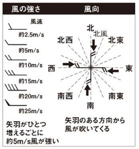 図3と図4は上空1,500m付近の風と気温の予想図です。風向は、予想図に描かれている棒に羽根のようなものがついている記号で判断します。図5のように、羽根が出ている方角から風が吹いてくると判断してください。