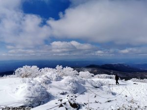 この日は、朝から韓国岳上空は晴れ渡り、霧氷に彩られた山の風景に見とれながら歩いていました。森林限界を超えると空が開けましたが、写真1のように遠くに(写真の奥の方)暗い雲の帯が見えるものの、他の所に雲はなく青空が広がっています。一方、午後になると写真2のように扁平型の塊状の雲が広がっていました。この雲は層積雲といい、北西の季節風が東シナ海を渡る間に、暖かい海面に触れて温められた海上の空気と、上空1,500~2,000m付近に流れ込んだ大陸からの冷たい空気によって、地上付近と高度約2km付近との狭い範囲で温度差が大きくなるときにできる雲です。東シナ海で生まれたこれらの雲は、上空を吹いている風によって流されていきます。