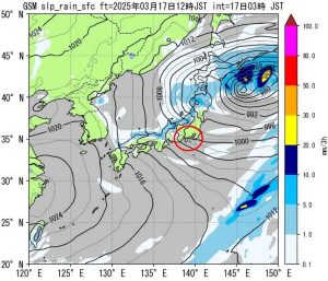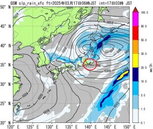 この日の天気図のような特徴が見られるとき、関東南部では時ならぬ、にわか雨やにわか雪に見舞われることがあります。平地では晴れていても箱根など山間部では積雪になることもあるので、覚えておきましょう。