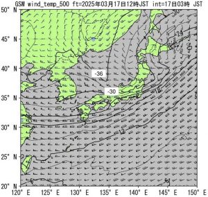 図2 500hPa面(上空約5,500m付近)の気温予想図(この日の12時)