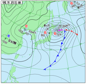 図4 この日の正午の地上気圧+降水予想図(ヤマテン「山の天気予報」より)